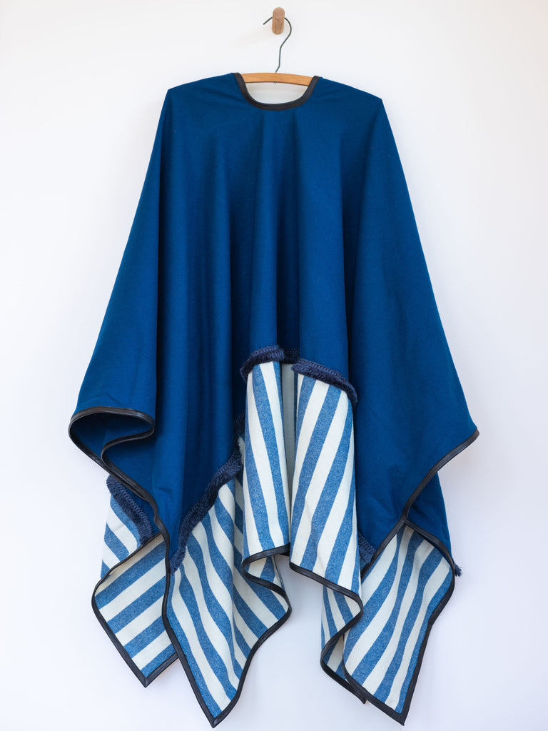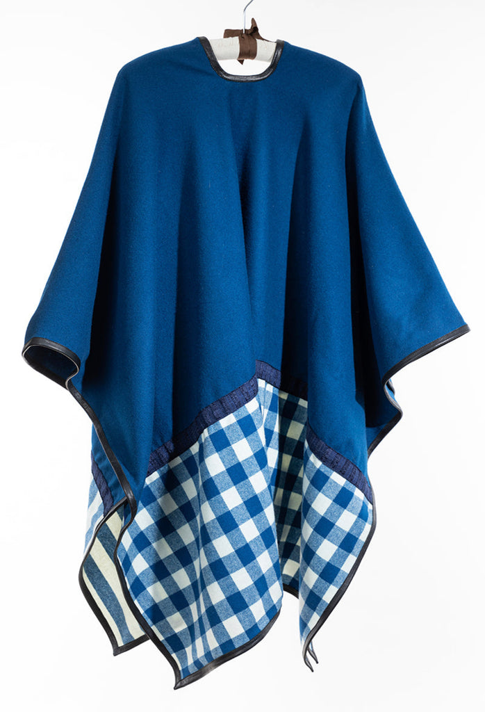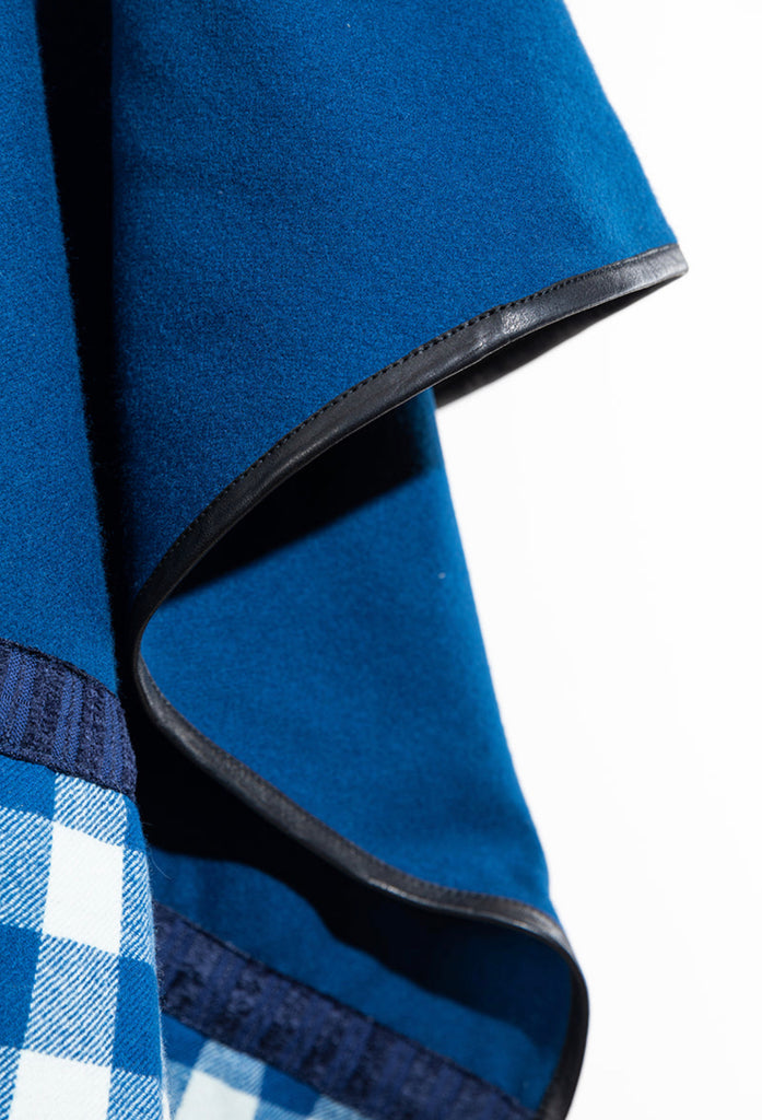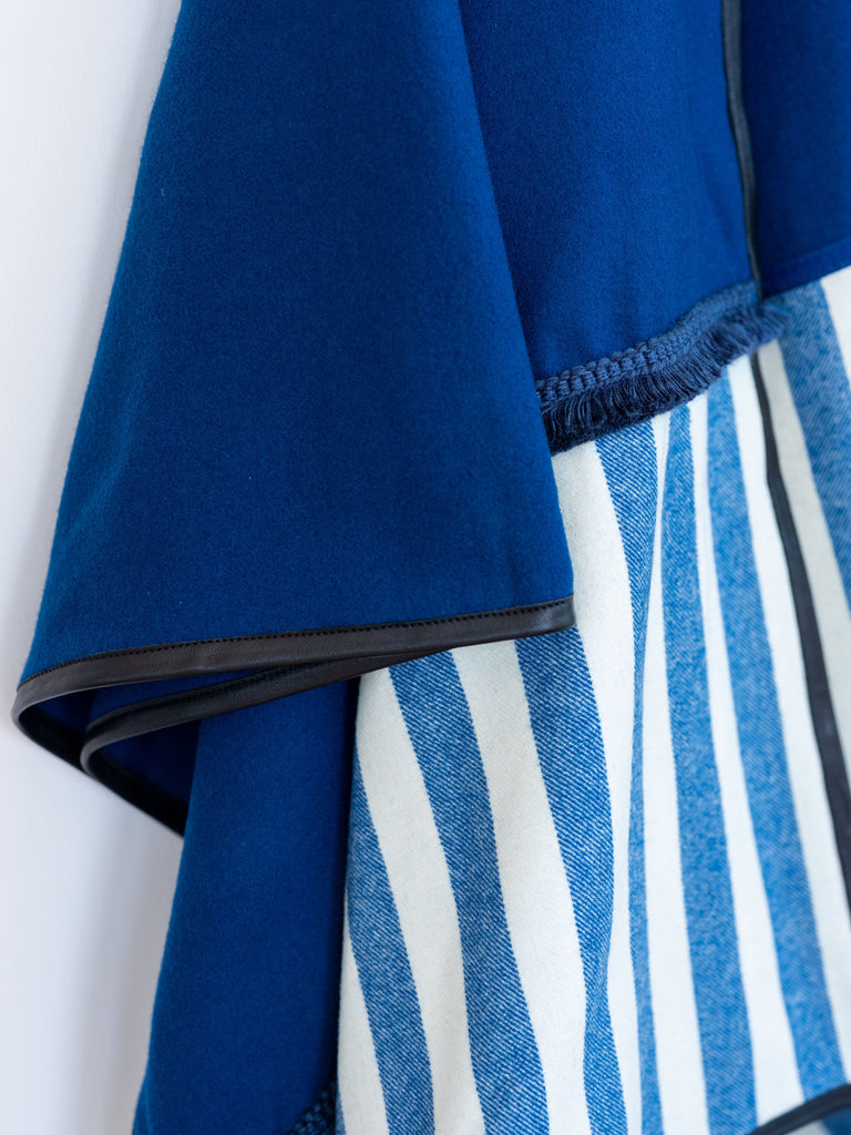 The woolen Royal Blue Cape is complete with buttery leather trim & is woven at the same mill as Loro Piana.