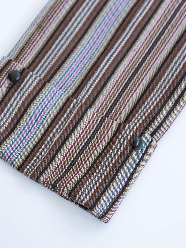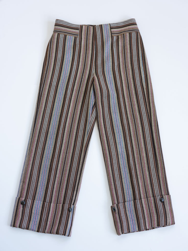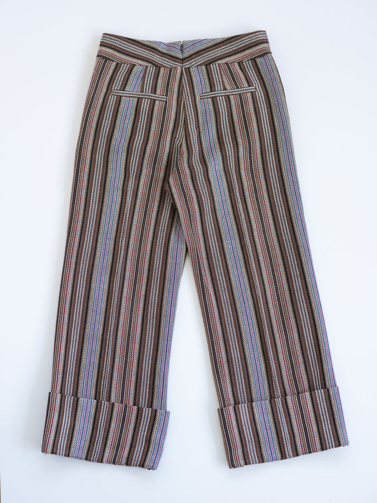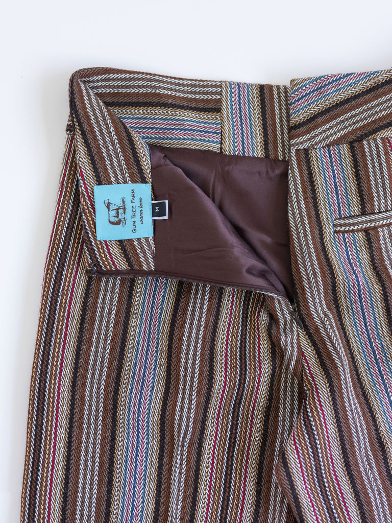 The Button Trousers boast a flattering A-Line silhouette & are crafted from our Bamboo & Merino blended Heritage Stripe fabric. The pants are accompanied by a soft silken blended lining in rich chocolate brown, while the hem showcases an adjustable cuff adorned with leather knot buttons for a secure fit.