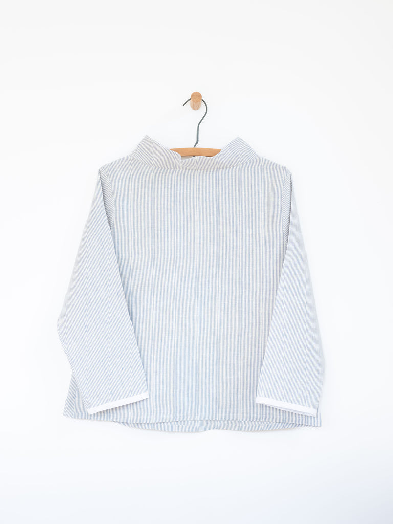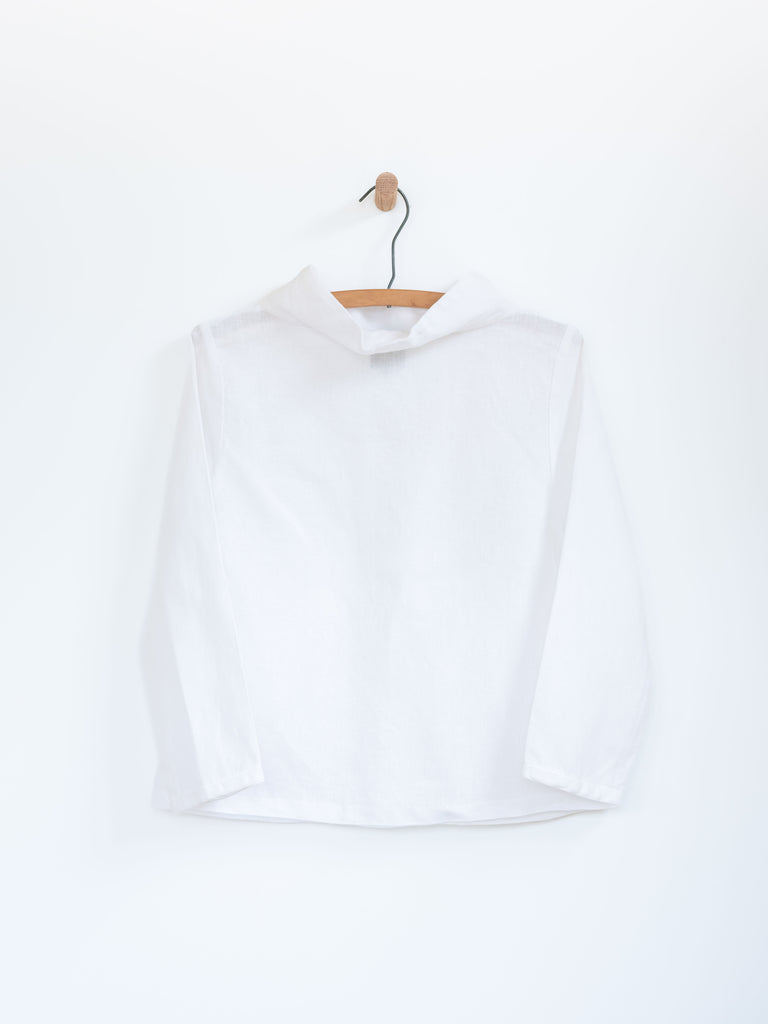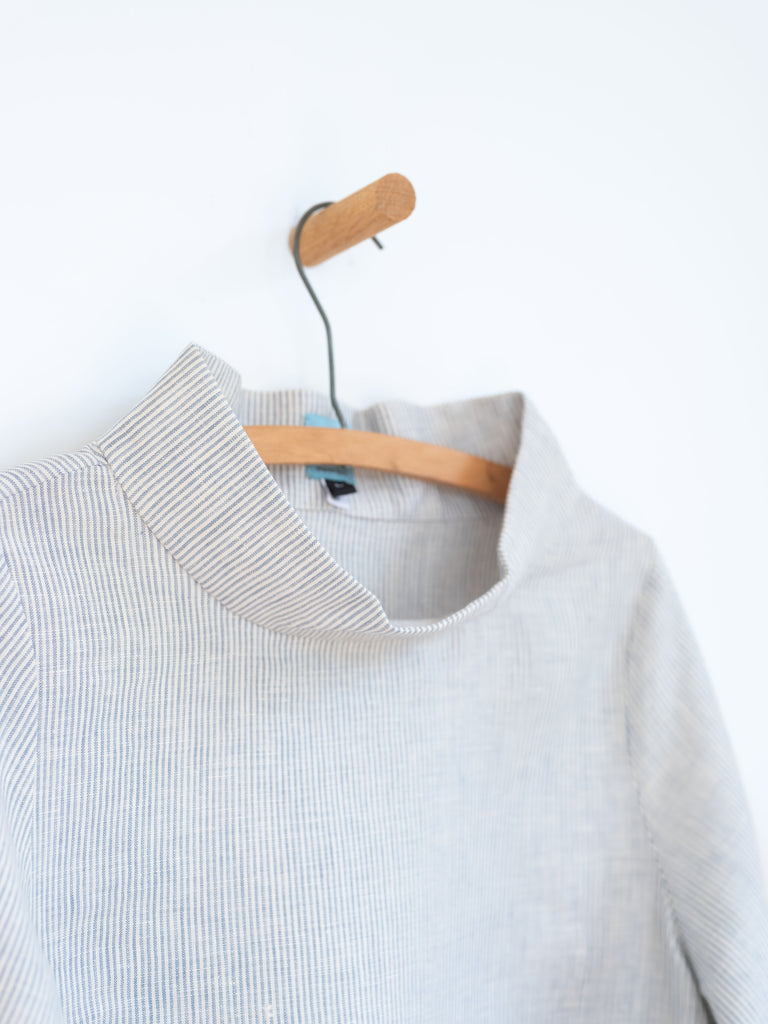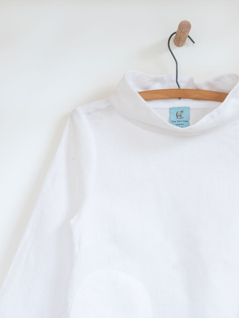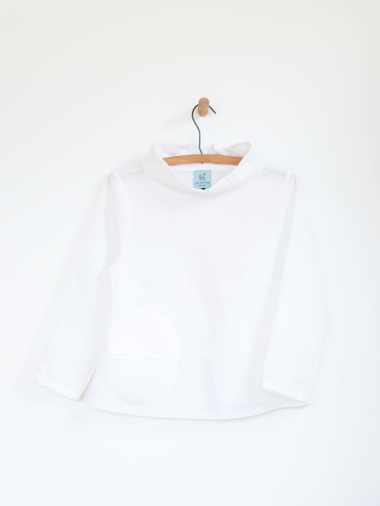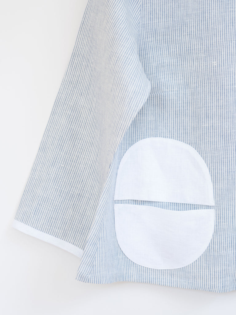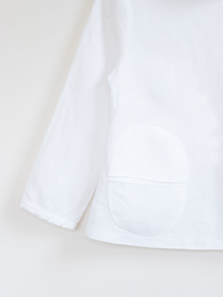 The Circle Shirt in Linen is lightweight & features a circular patch pocket on the front right side. Inspired by Mattise's Cut-Out work, the shape of the pocket represents the fabric cut away from the neckline of the shirt. The sleeves are three-quarters in length, & the body of the shirt has a slight emphasis on the natural waist, creating a causal hourglass silhouette.