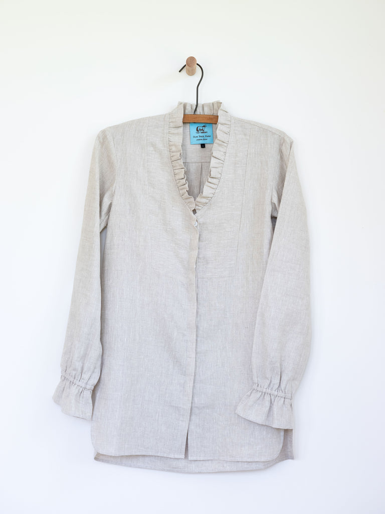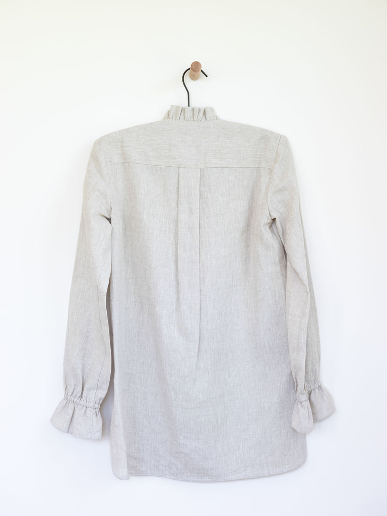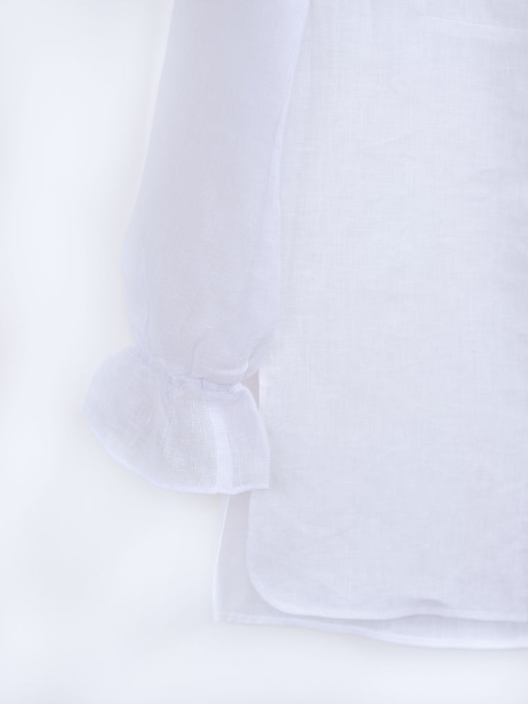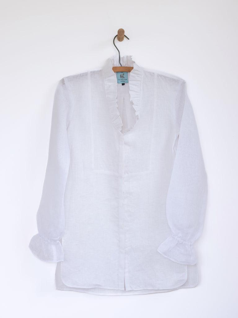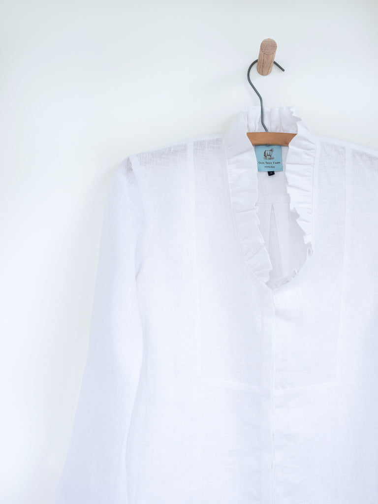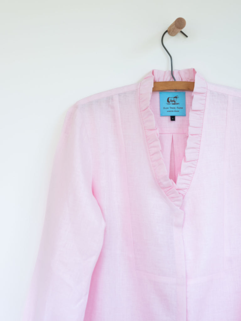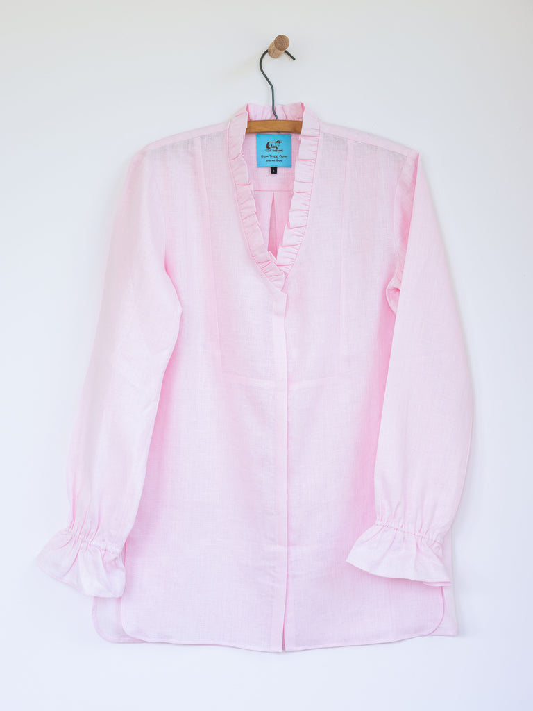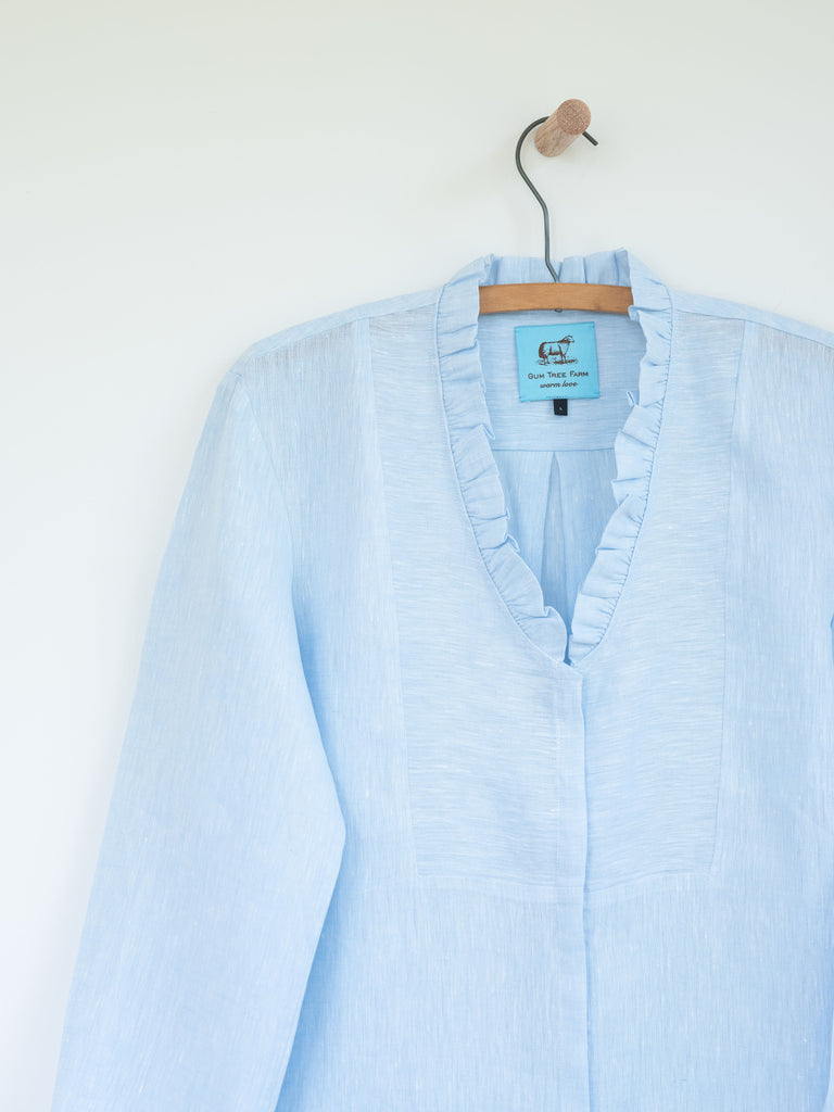 The Ruffled Tunic in Linen has a straight silhouette with a ruffled V-neckline. The sleeves also have a line of ruffles along its hem. The Ruffled Tunic in Linen is the perfect summer shirt for going to brunch or on vacation.