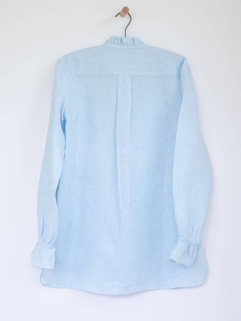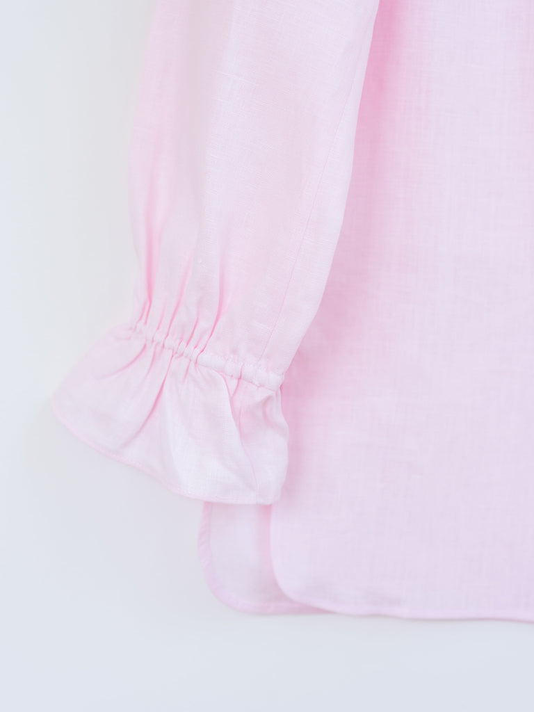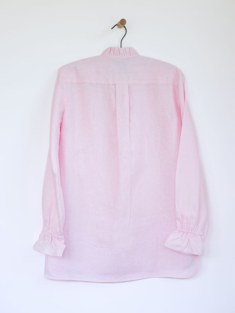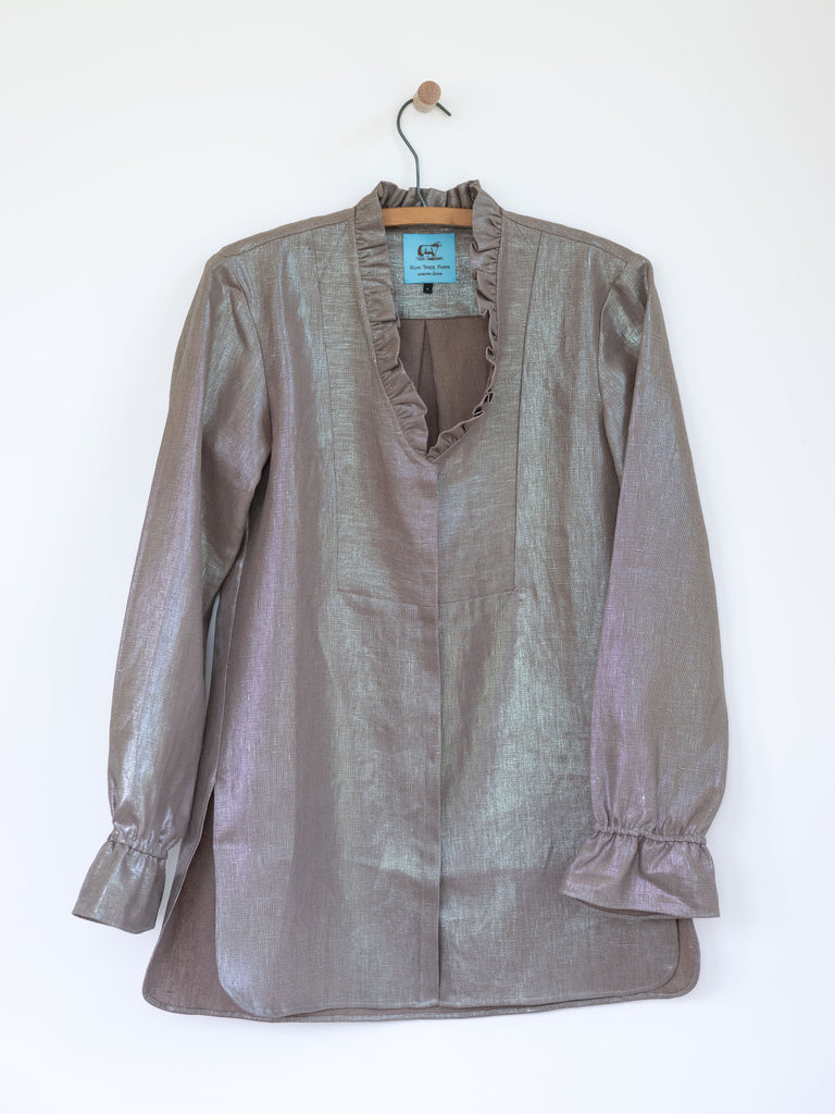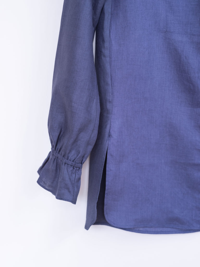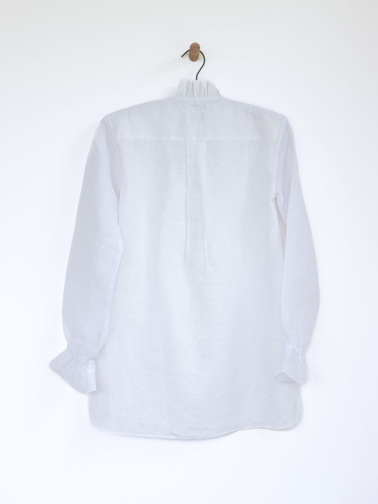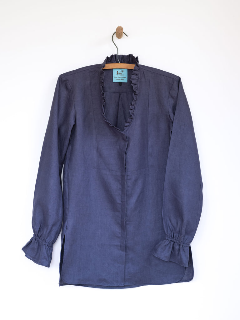 The Ruffled Tunic in Linen has a straight silhouette with a ruffled V-neckline. The sleeves also have a line of ruffles along its hem. The Ruffled Tunic in Linen is the perfect summer shirt for going to brunch or on vacation.