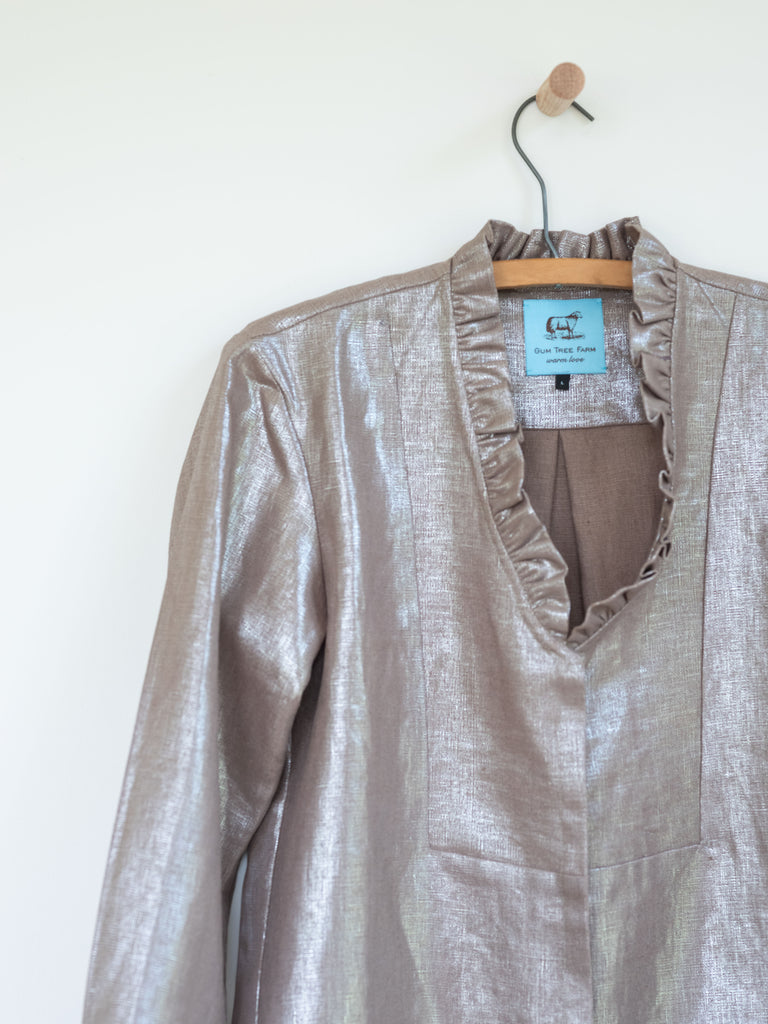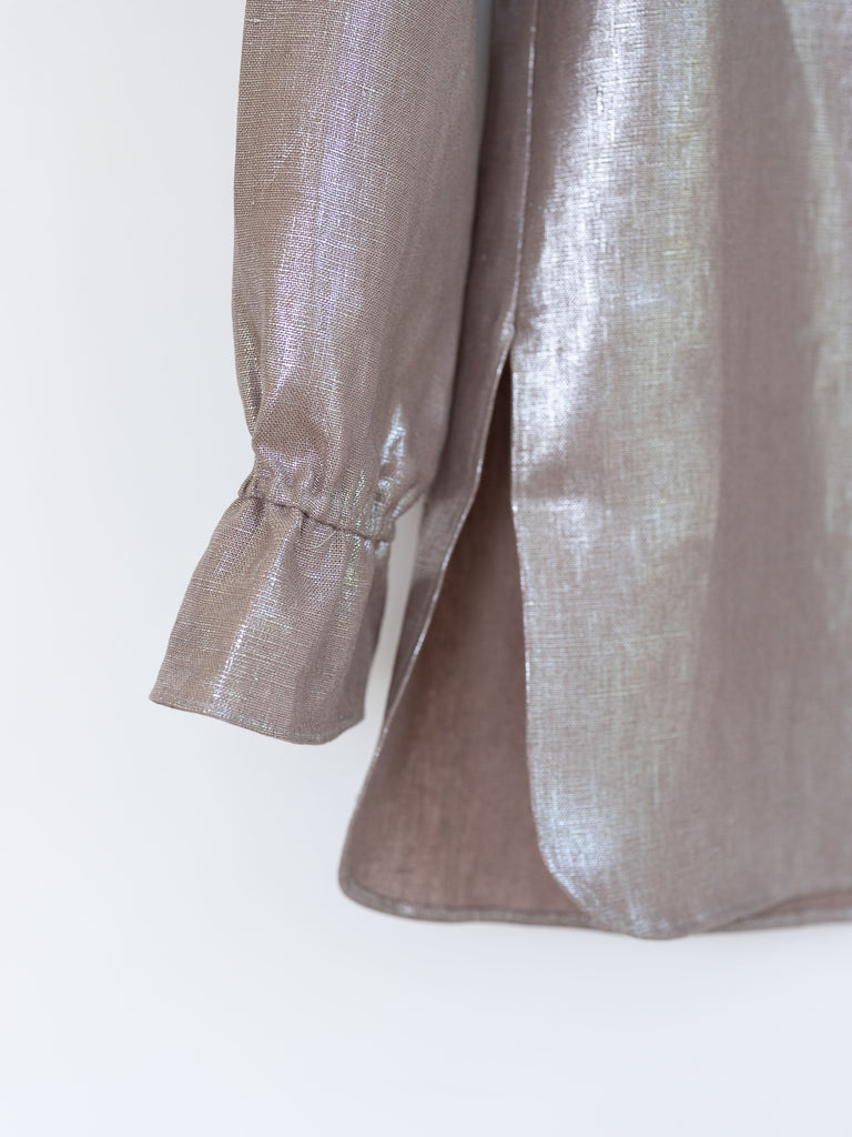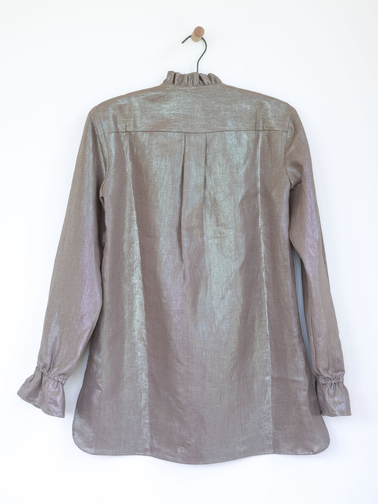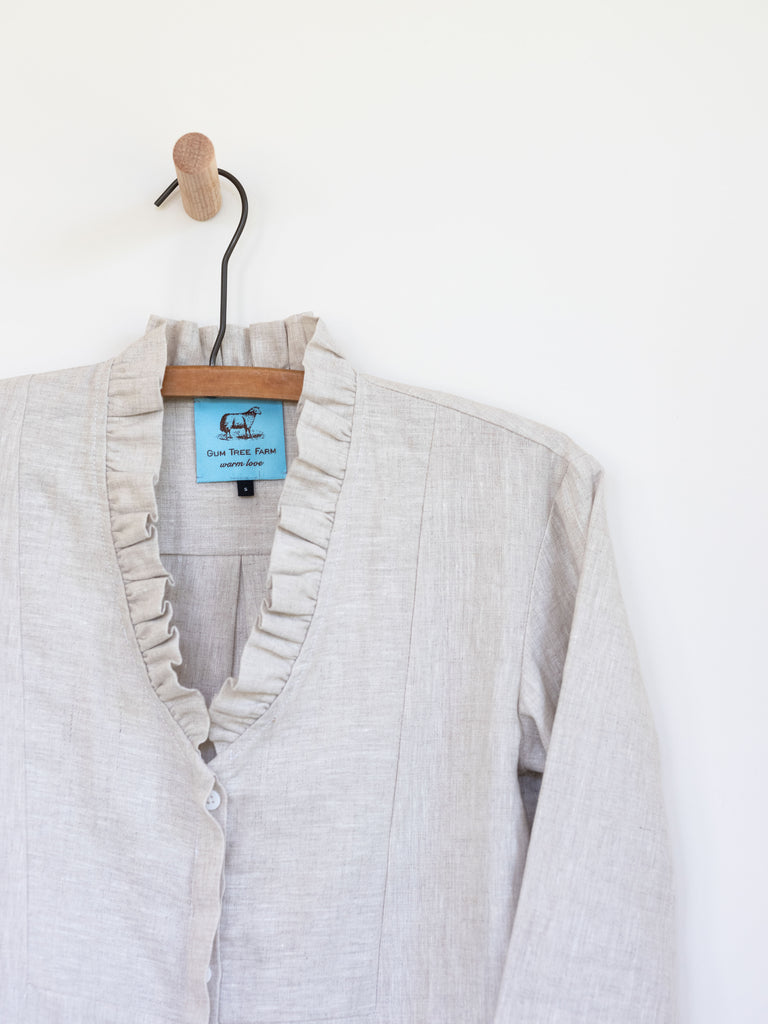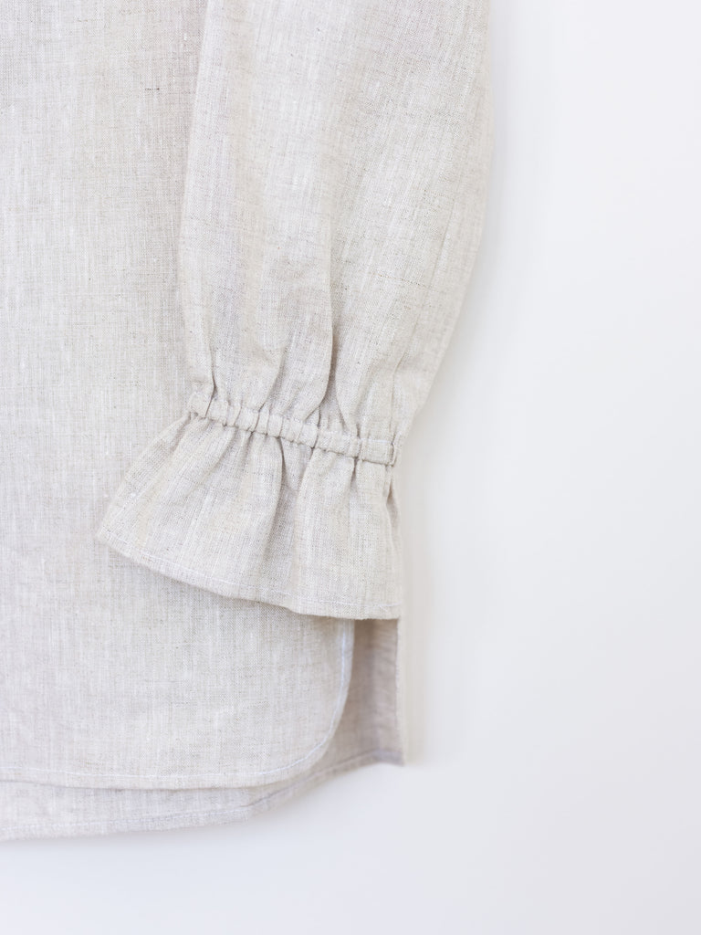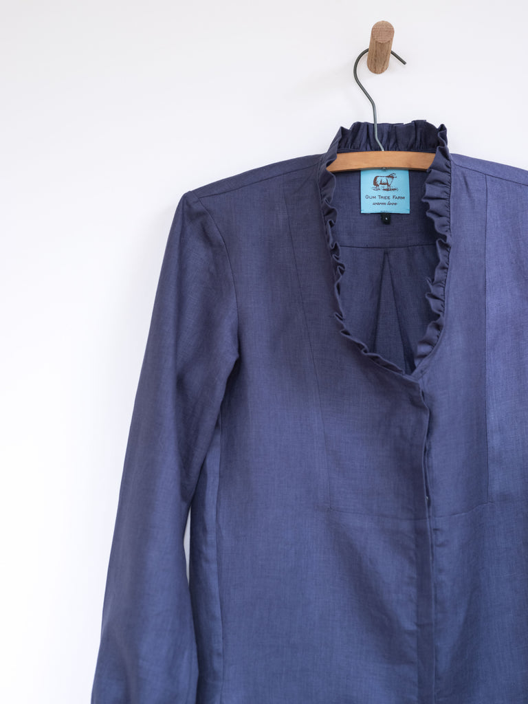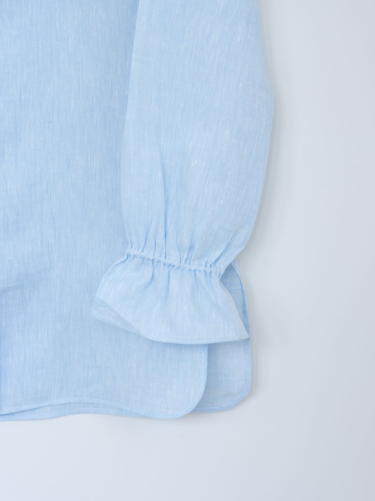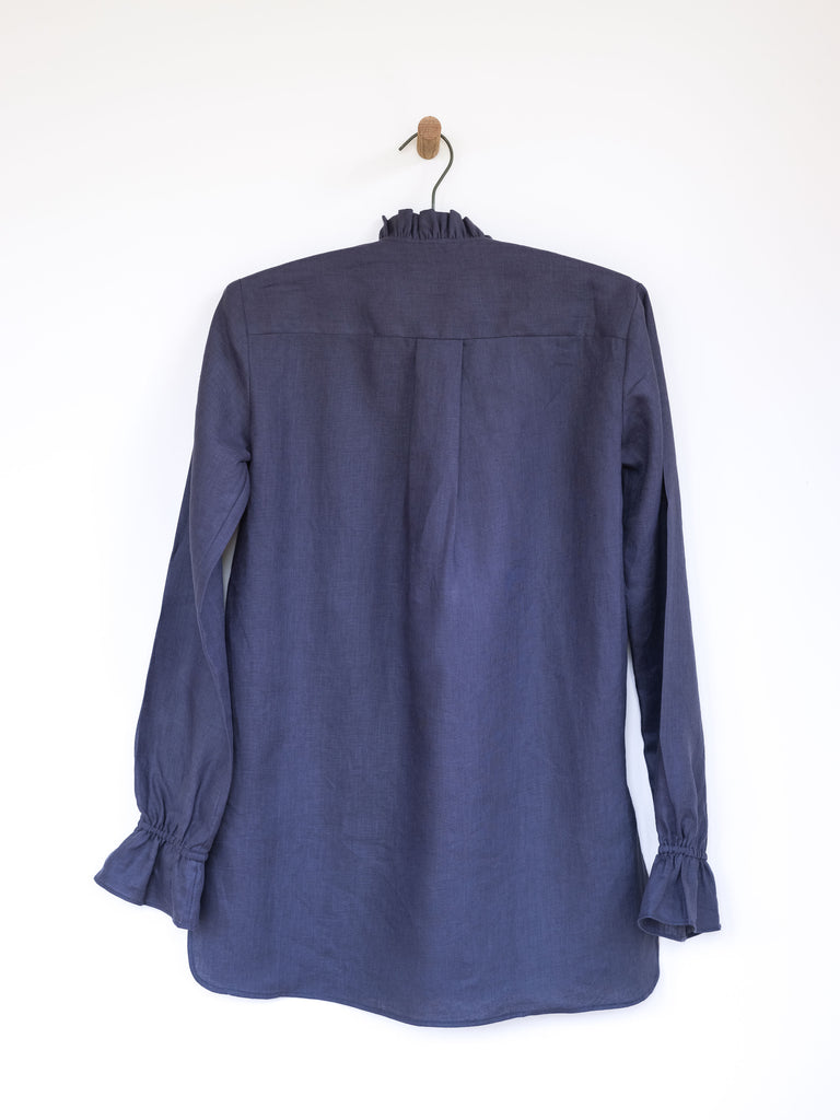 The Ruffled Tunic in Linen has a straight silhouette with a ruffled V-neckline. The sleeves also have a line of ruffles along its hem. The Ruffled Tunic in Linen is the perfect summer shirt for going to brunch or on vacation.