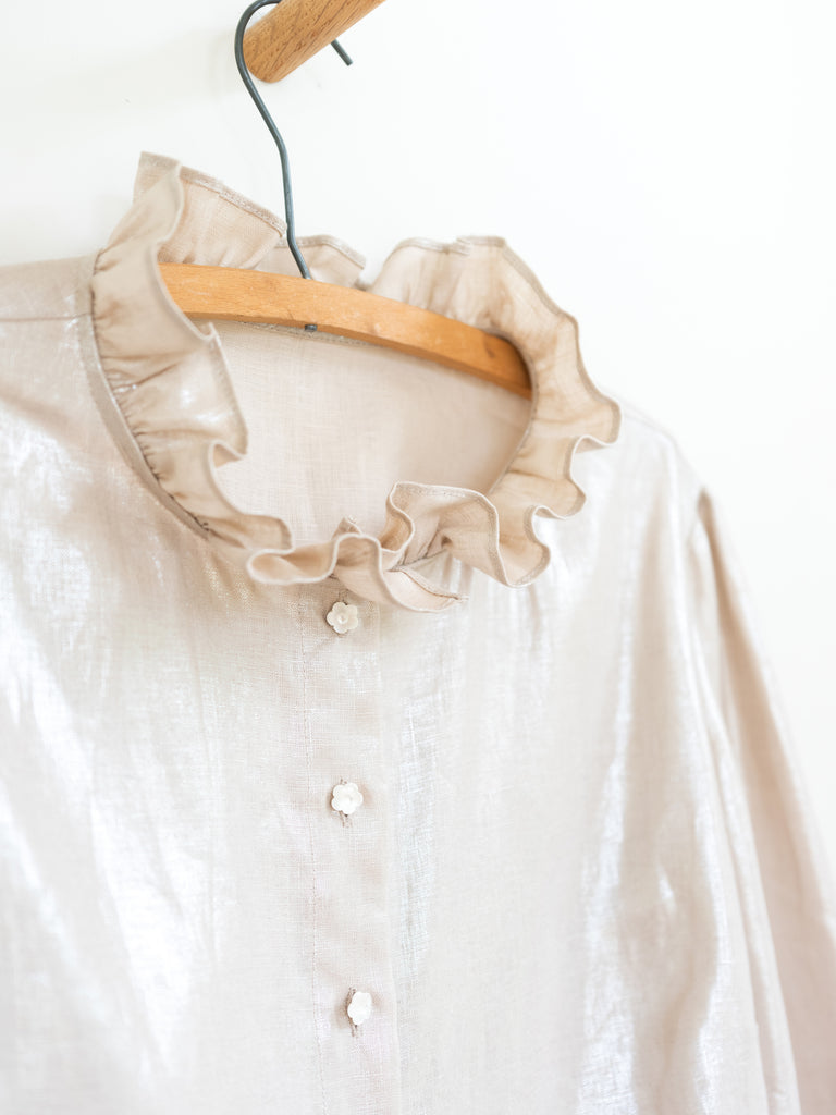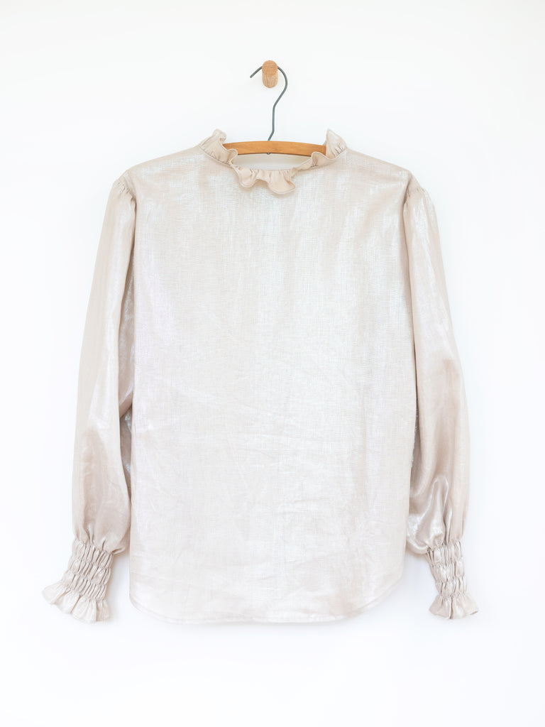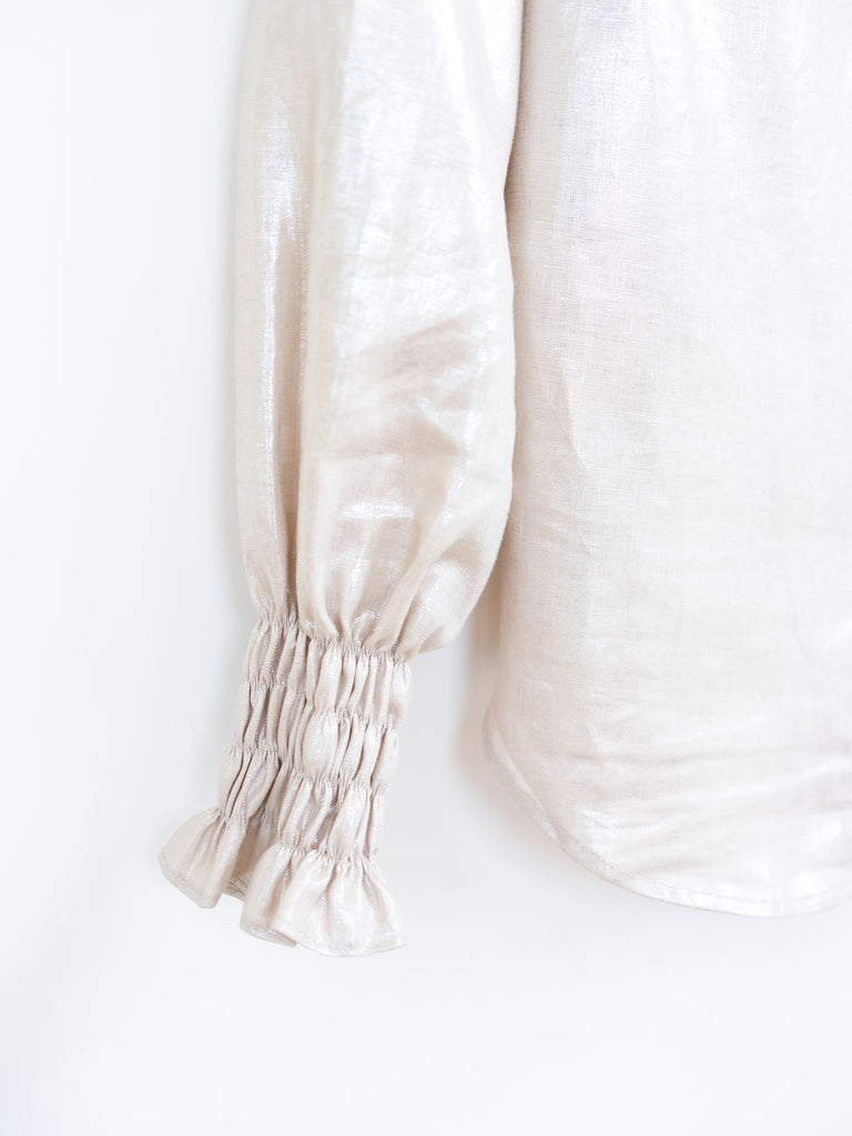 Made in linen, the Peasant Blouse features a delicate ruffled collar & elegantly ruched cuffs. Adorned with dainty floral buttons, this blouse exudes a subtle, yet sophisticated charm.