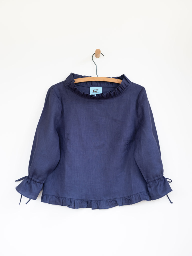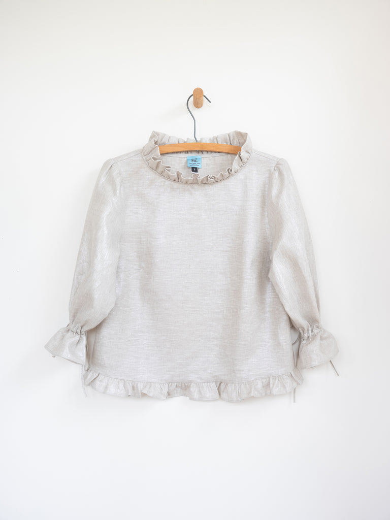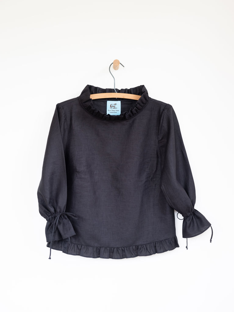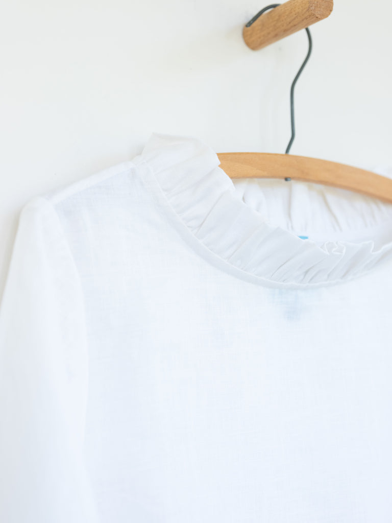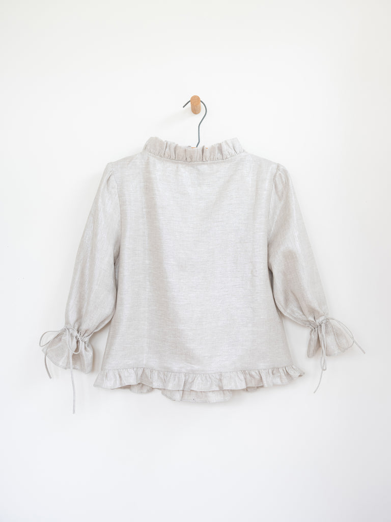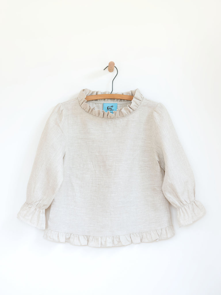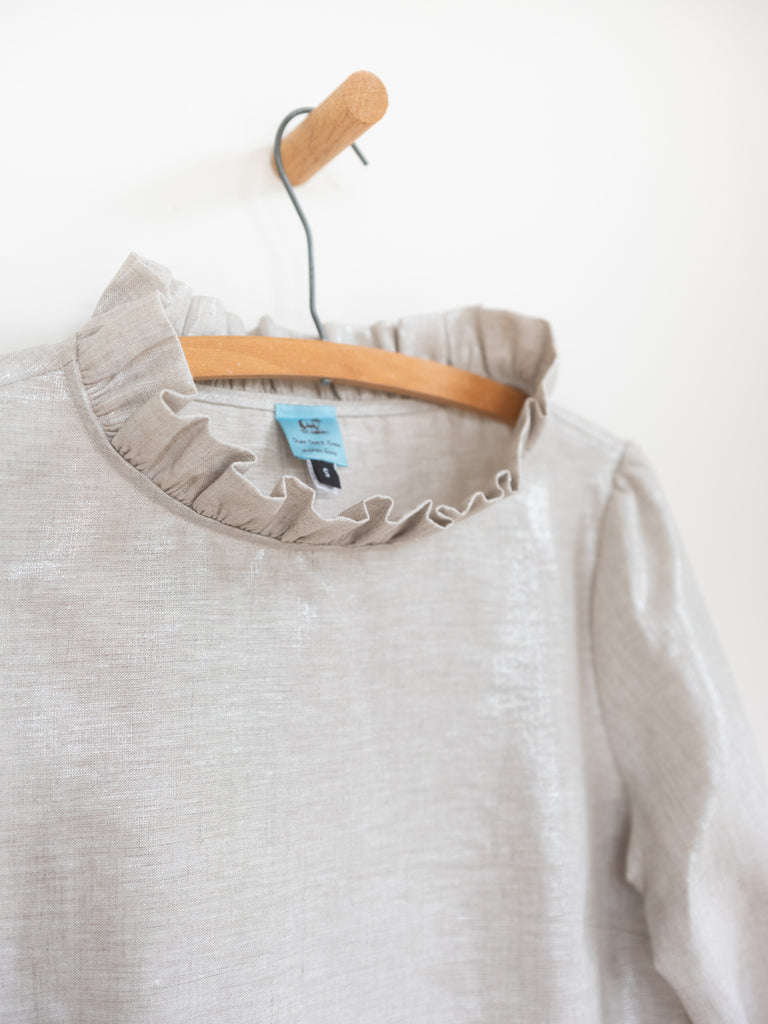 The Ruffled Audrey in Linen is a Gum Tree Farm classic silhouette adorned with bows on the cuffs & a ruffled collar. This lightweight top provides a timeless look for any occasion.