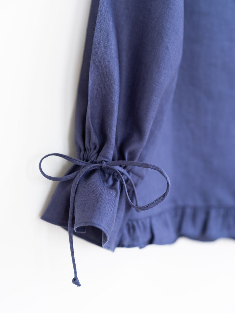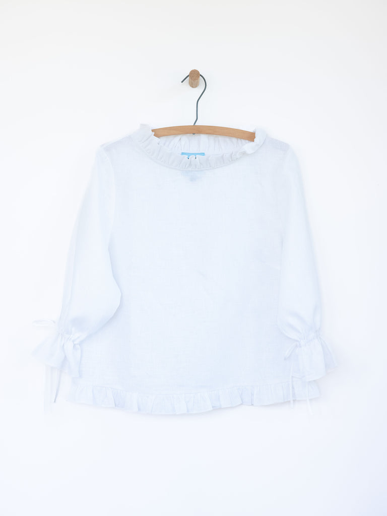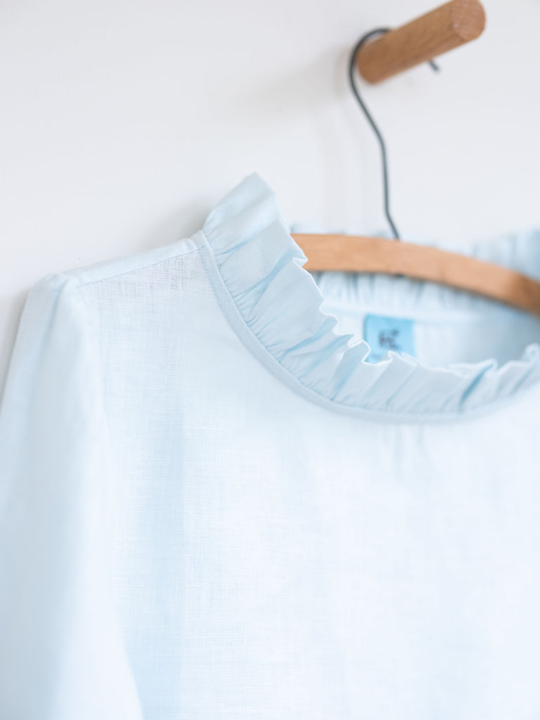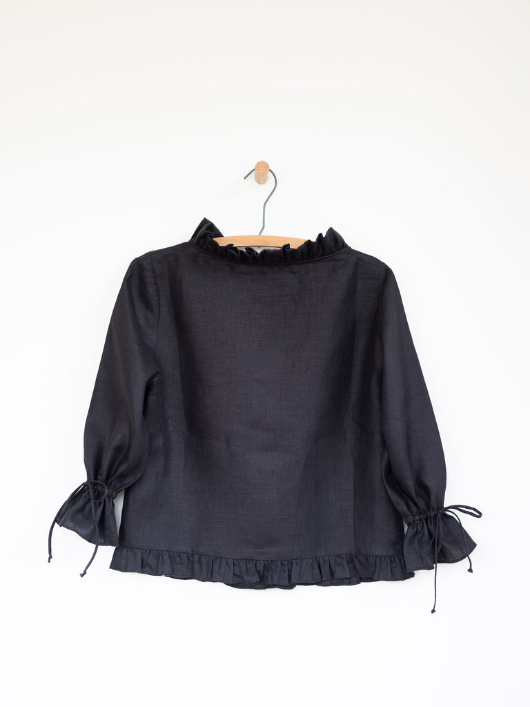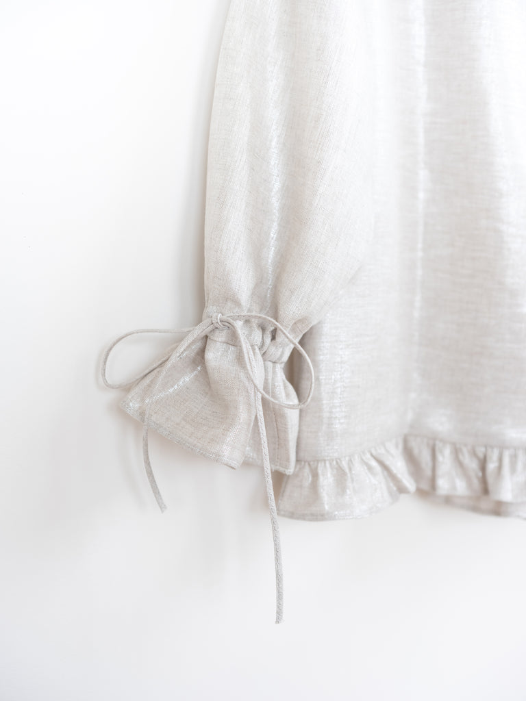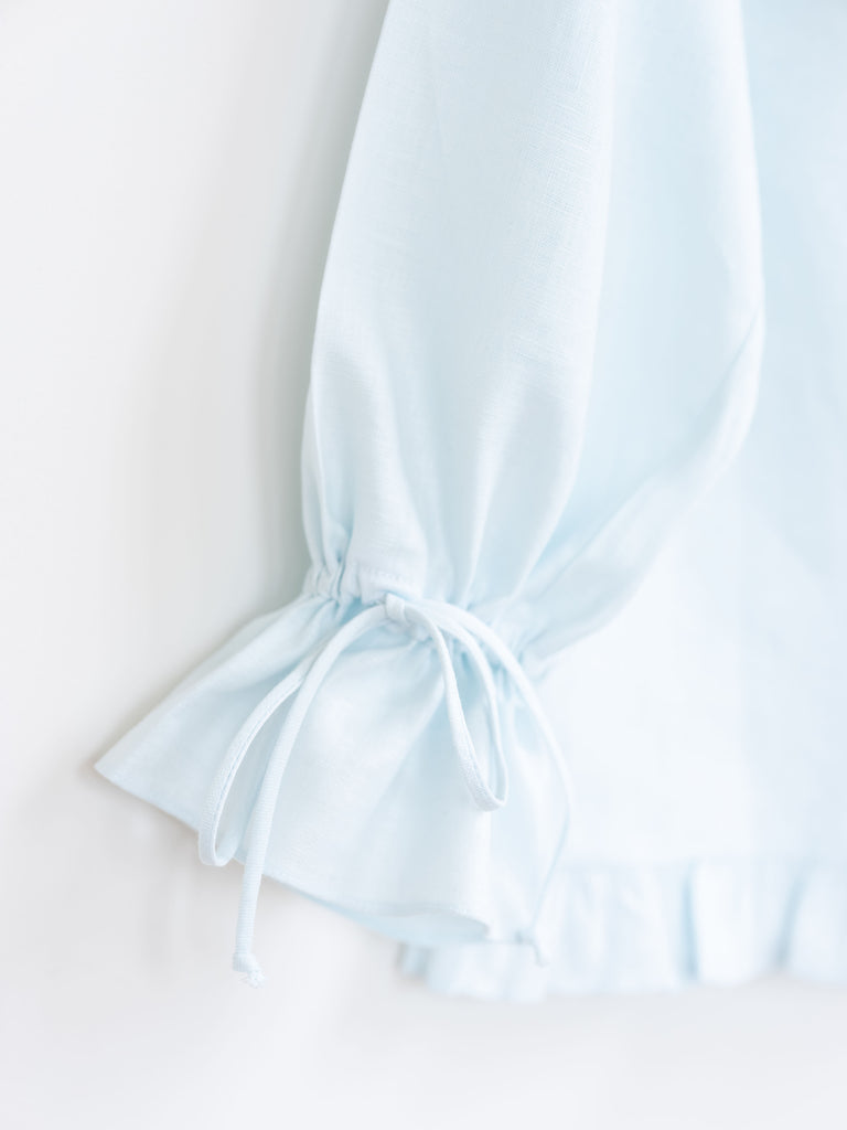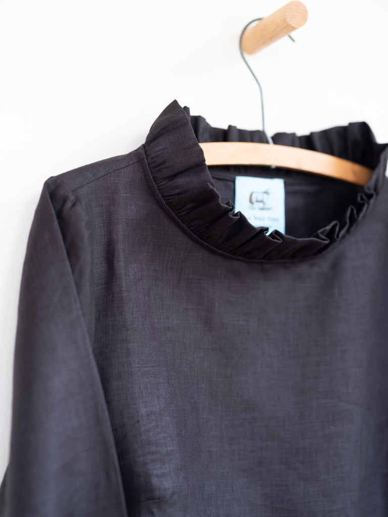The Ruffled Audrey in Linen is a Gum Tree Farm classic silhouette adorned with bows on the cuffs & a ruffled collar. This lightweight top provides a timeless look for any occasion.