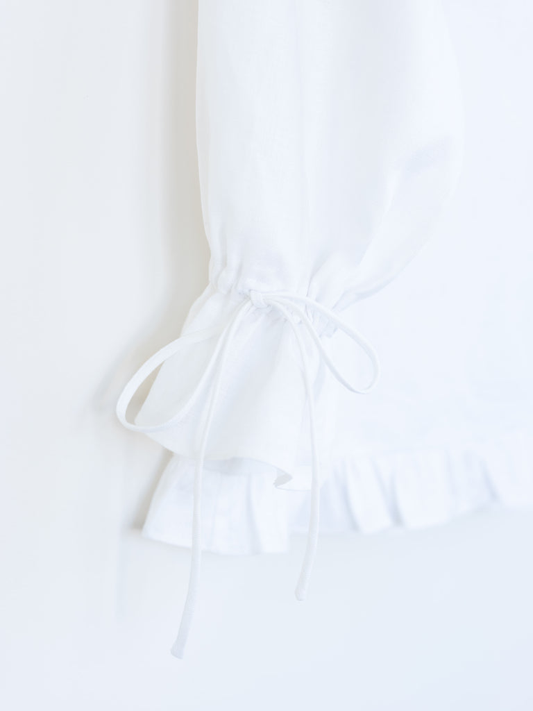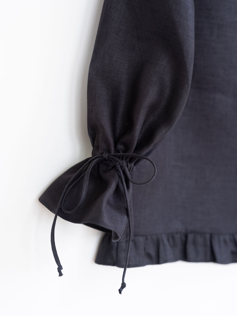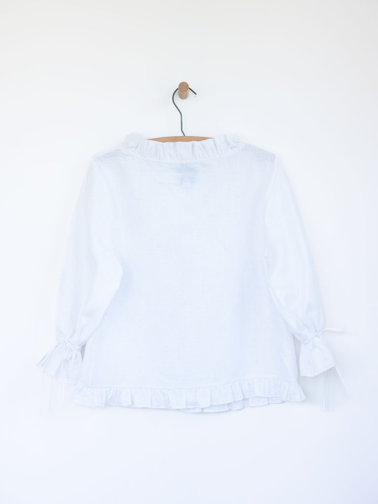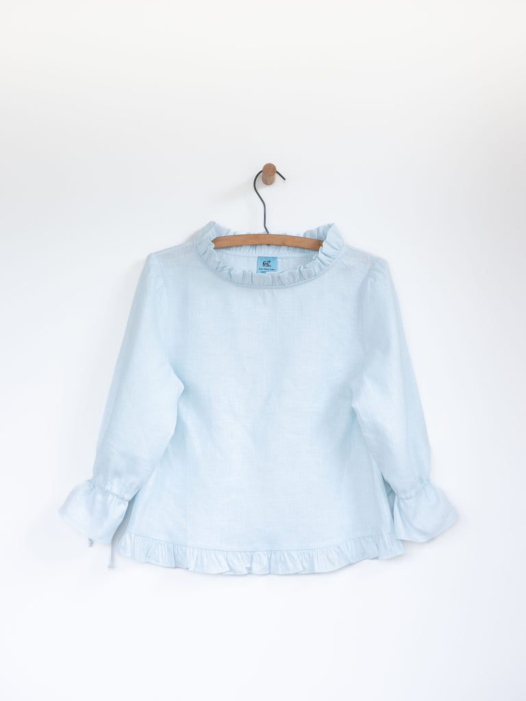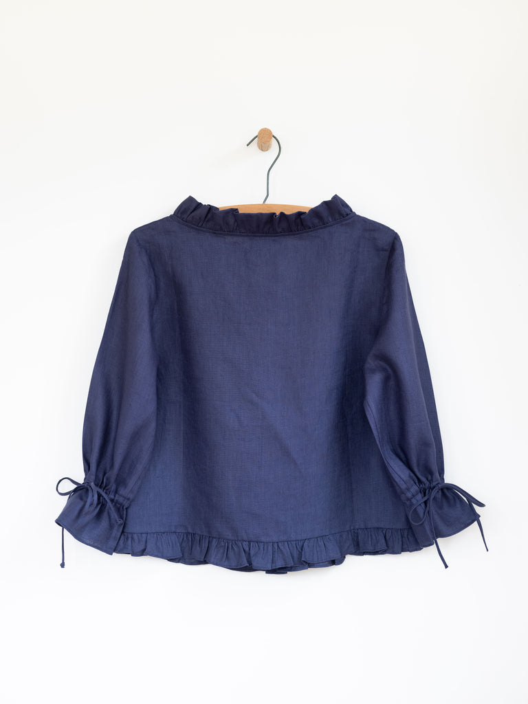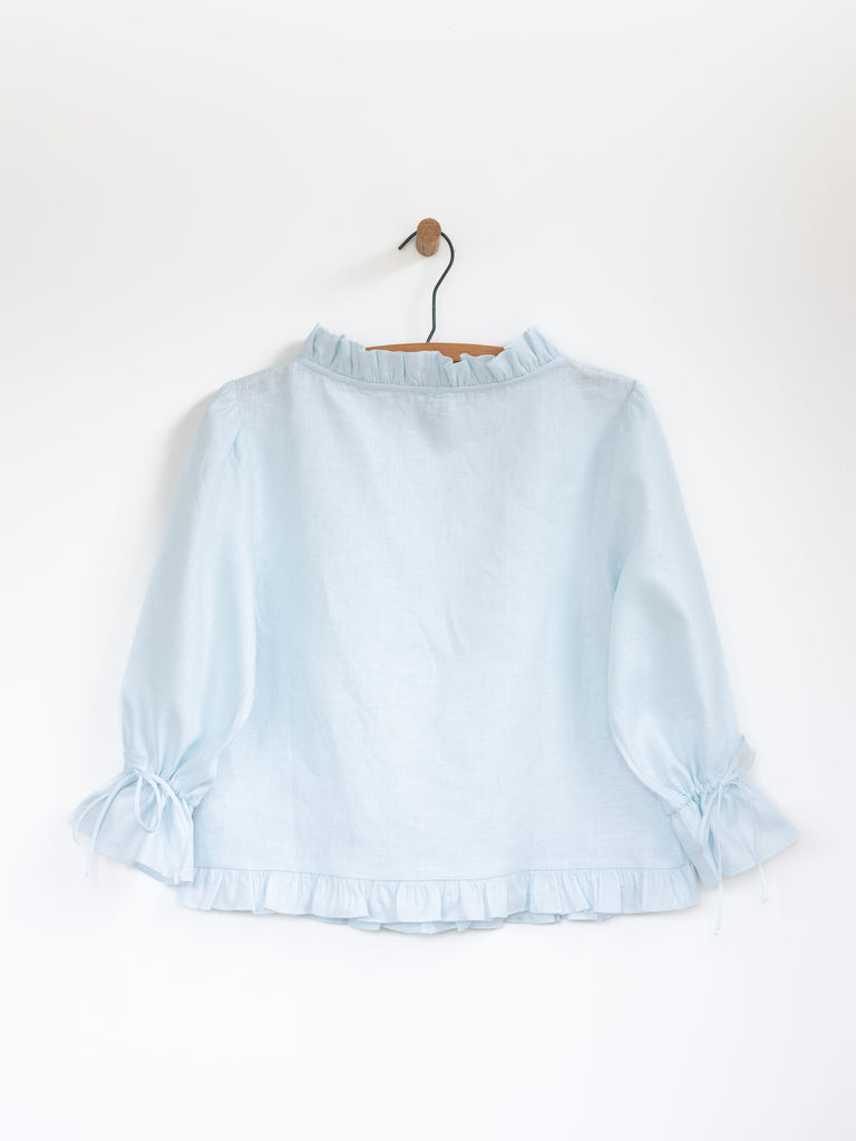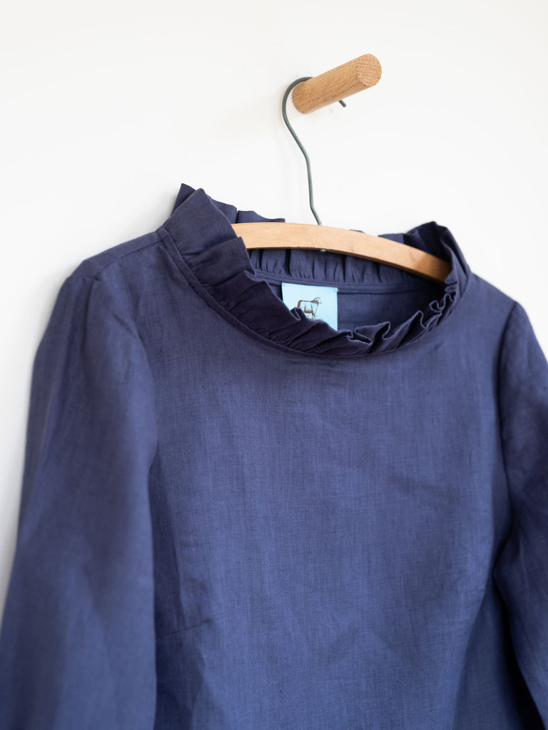 The Ruffled Audrey in Linen is a Gum Tree Farm classic silhouette adorned with bows on the cuffs & a ruffled collar. This lightweight top provides a timeless look for any occasion.